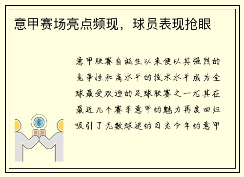 今年的意甲赛季无疑是一场充满激情、竞争和梦想的足球盛宴。球员们的精彩表现、球队之间的激烈对抗以及战术层面的创新,让这个赛季的意甲赛场充满了无尽的看点。随着赛季的深入,越来越多的球员与球队将继续为我们带来更多精彩的比赛。对于球迷来说,意甲的每一场比赛都是一次不可错过的视觉盛宴。而对于球员来说,赛场上的每一次拼搏和突破,都是他们不断超越自我的证明。