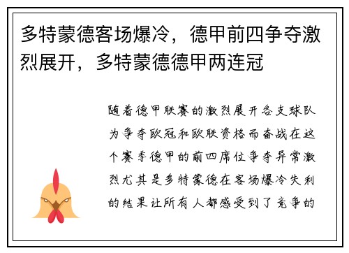 多特蒙德客场爆冷,德甲前四争夺激烈展开,多特蒙德德甲两连冠