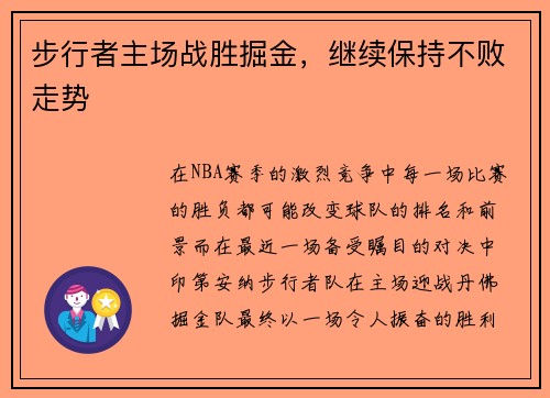 在NBA赛季的激烈竞争中,每一场比赛的胜负都可能改变球队的排名和前景。而在最近一场备受瞩目的对决中,印第安纳步行者队在主场迎战丹佛掘金队,最终以一场令人振奋的胜利结束了这场较量,继续保持着他们在本赛季的强势不败走势。这场比赛不仅仅是步行者队的胜利,更是他们团队默契、战术执行以及球员个人表现的完美体现。