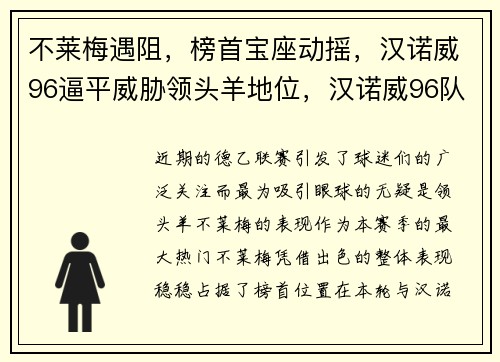 不莱梅遇阻,榜首宝座动摇,汉诺威96逼平威胁领头羊地位,汉诺威96队